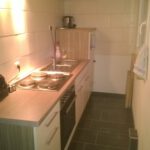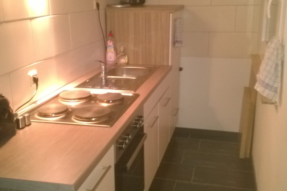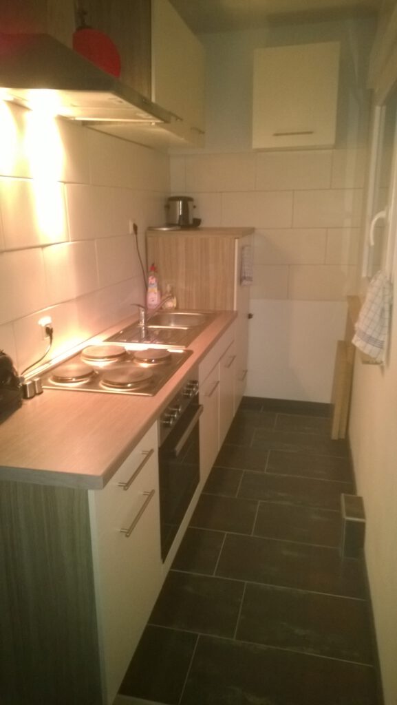 • dunkle Fliesenböden vorhandene Einbauküche